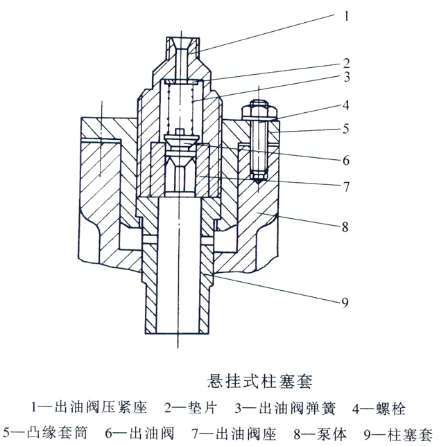 P型喷油泵悬挂式分泵柱塞套结构与工作原理、宁南汽配城卖康明斯配件皮带零件查询船用柴油机配件附近哪里有珀金斯发动机换四配套, 柱塞套9和出油阀6、出油阀座7都在凸缘套筒5内,并利用出油阀压紧座1拧紧,使它成为一个独立的组件。然后用两个螺栓将凸缘套筒固定在泵体顶端面上,形成一种悬挂式结构。在出油阀压紧座拧紧后,柱塞套仅仅是上部台肩承受压力,而进、回油孔部位都不受力,从而避免了柱塞套在进、回油处受压变形。