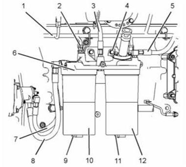 6. 使用带1/2“方头驱动的适当工具拆下燃油滤清器总成(10)和(12)。拆下O形密封圈。拆下燃油滤清器滤芯。有关更多信息,请参阅操作和保养手册“燃油滤清器-更换”。