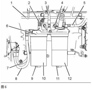 4. 安装新的 O形密封圈至燃油旁通阀 (6).安装燃油旁通阀至燃油滤清器底座总成(1). 拧紧燃油旁通阀 (6) 至扭矩 35 N•m (26 lb ft).