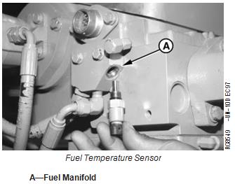 1. Disconnect fuel temperature sensor wiring connector and remove sensor from fuel manifold (A).