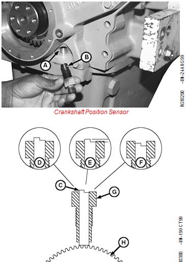 C—Pin (In JDG1334 Depth Checking Tool) D—Sensor Depth Low (Shim Required) E—Sensor Depth Correct (No Shim Required) F—Sensor Depth too High (Requires