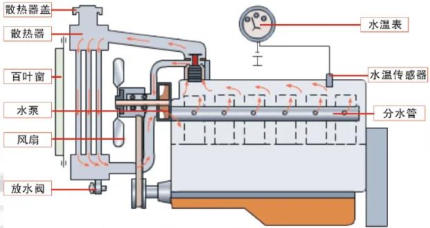 散热器的进水管与缸盖水套相通,出水管通过水泵与缸体水套相通。发动机运转时,水泵将冷却液在水套与散热器之间进行循环,把发动机水套内高温的冷却液抽入散热器进行散热,再将散热后的低温冷却液送入水套继续对发动机进行冷却。