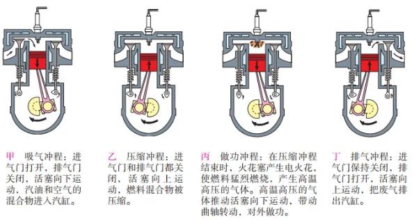 ③两种发动机运转的第一循环,都必须靠外力使曲轴旋转,才能完成进气和压缩行程;做功行程开始后,做功能量储存在飞轮内,以维持循环继续进行。