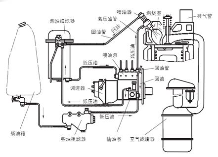 ①燃油供给装置:由柴油箱、输油泵、低压油管、柴油滤清器、喷油泵(包括调速器)、高压油管、喷油器、回油管组成。