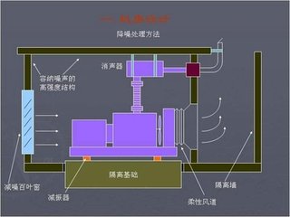 对于柴油发电机组的机械噪声、燃烧噪声等通过辐射的方式传播的噪声,通过机房进行隔声处理,机房既要密封、隔声效果好,又要保证机房内空气的顺畅流通。一般采取240及以上的砖墙、隔声门、隔声窗、消声器等治理措施。