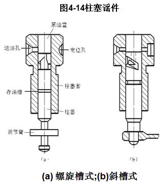 柱塞偶件是产生高压油的压油元件,其结构如图4-14所示。柱塞套装在泵体座孔内固定不动,柱塞由凸轮驱动,在柱塞套内上下往复运动。此外,可绕自身轴线在一定角度转动。柱塞头部的圆柱表面铣有螺旋槽或斜槽,并利用直槽或中心孔(径向孔和轴向孔)使槽与柱塞上方泵腔相通。柱塞套上部开有一个进油和回油用的径向小孔与泵体上的低压油腔相通,有的则开有两个径向小孔,两个小孔的中心线可以在一个水平线上,也可不在同一水平线上,上面的为进油孔,下面的为回油孔。柱塞弹簧通过弹簧座将柱塞推向下方,使柱塞下端与滚轮式挺杆接触,并使挺杆中的滚轮与下凸轮接触。