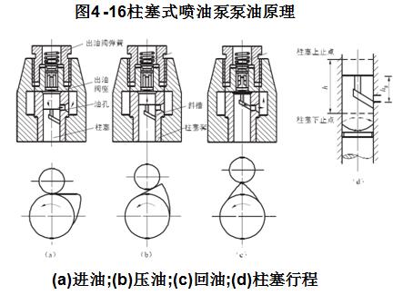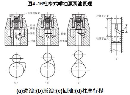 由上述泵油过程可知,由驱动凸轮轮廓曲线决定的柱塞行程h(即柱塞的上、下止点间的距离)是一定的,但并非在整个柱塞上移行程h内都供油。喷油泵只是在柱塞完全封闭油孔之后到柱塞斜槽与油孔开始接通之前的这一部分柱塞行程hg内才泵油。hg称为柱塞有效行程(如图4-16 (d)所示)。显然,喷油泵每次泵出的油量取决于有效行程的长短,因此欲使喷油泵能随发动机工况不同而改变供油量,只需改变有效行程,一般通过改变柱塞斜槽与柱塞套油孔的相对角位置来实现。 ③出油阀的作用。出油阀的作用分以下三个方面。