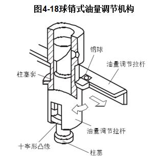 ②球销式油量调节机构如图4-18所示。其工作原理与齿杆式油量调节机构比较相似。油量调节套筒松套在柱塞套上,在下面缺口中嵌入十字形凸缘,其上部镶嵌一个钢球。在油量调节拉杆水平的直角边上开有小槽,工作时槽口和油量调节套筒上的钢球啮合。当移动油量调节拉杆时,槽口带动钢球使调节套与柱塞一起转动,从而达到调节供油量的目的。