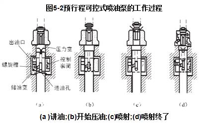 当柱塞上的螺旋槽与控制套筒上的出油口连通时,压力室内的高压燃油通过柱塞上的螺旋槽排至储油室,压力室内的油压急剧下降,从而停止泵油,如图5-2 (d)所示。