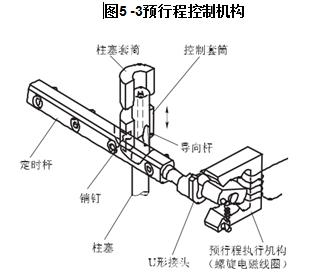 预行程控制机构,如图5-3所示。控制套筒在导向杆的引导下可上下移动,而控制套筒的上下移动是由预行程执行机构(螺旋电磁线圈)通过U形接头转动定时杆,并由其上的销钉拨动控制套筒上下移动来改变预行程的。