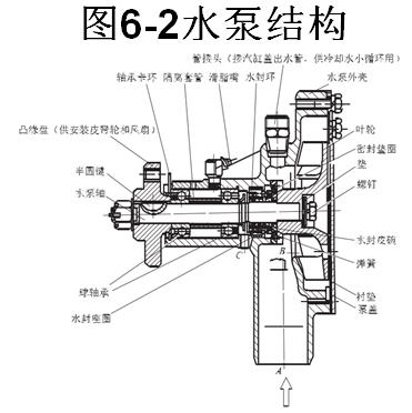 水泵进水管通过软管与散热器下水室连通,冷却液直接进入水泵腔室的中央部位。在水泵中央部位安装有管接头,通过旁通管与节温器副阀门连通。从副阀门流出的冷却液通过该管接头直接进入水泵腔室。水泵腔室后侧用泵盖封闭,泵盖上的出水口正对水泵泵腔的出水室。将水泵固定于发动机后,泵盖上的出水口与水套的分水管进水口对接。在泵壳的油封与轴承座孔之间设有泄水孔,当水封有少量的水滴泄漏时,可以从该孔泄出。若当发动机熄火后仍然有水泄出,则应拆开水泵进行修理。