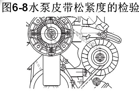 应经常检查皮带的松紧度,防止由于皮带打滑而使水泵工作不良。如图6-8所示,用手以9-29 N的力在皮带中部按下,皮带的下移量应以3-6 mm为宜。