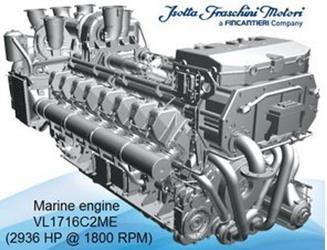 新型 Isotta 推进发动机 V 1712 C2 MLH 船用柴油发动机,四冲程循环柴油发动机,博世高压共轨燃油喷射系统,带废气涡轮增压器和管式原水/增压空气中冷的增压系统,发动机冷却系统设计用于淡水/海水龙骨冷却型热交换器,带有集成集水箱和恒温控制,绝热排气歧管。