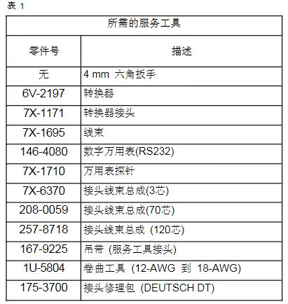 卡特电气服务工具被设计用来帮助服务工程师完成以下任务:• 获得信息• 分析系统• 系统校准• 系统设置• 数据链路通讯所需的服务工具表1列出的工具是服务工程师完成本手册上的测试程序所需要的。