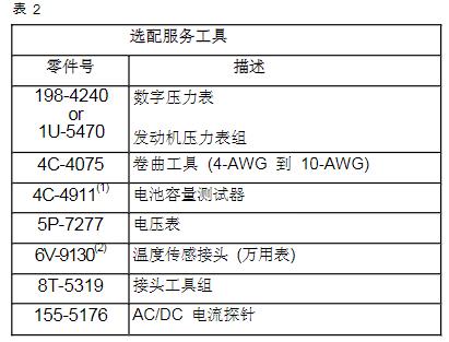 需要两根短跳线,以短路同一个接头的两个相邻端子方式,来检查一些线束回路的导通情况。也需要一根延长线路来检查一些线束回路的导通情况。可选配的服务工具表2列出了在测试或维修中可能需要的可选配服务工具。
