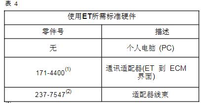 注意:更多卡特ET的使用信息和对应计算机配置需求,请参阅卡特ET软件的相关文档。连接ET用通讯适配器II连接表4列出连接卡特ET所需要的标准硬件。