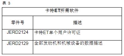 (2)参阅《特别指导》SEHS8382“ 温度传感接头组6V-9130的使用”。卡特电子技术装置(ET)卡特ET能显示以下信息• 参数• 事件代码• 诊断代码• 发动机设置技术人员使用卡特ET能实现以下功能:• 诊断测试• 校准• 刷新程序• ECM设置表3列出使用卡特ET所需要的软件。