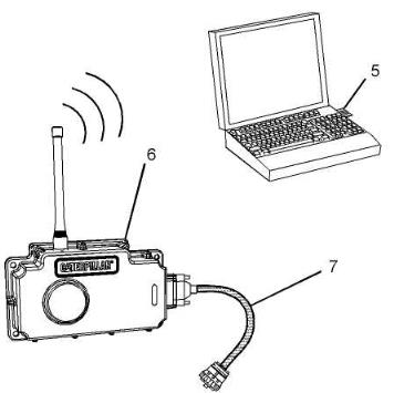 (1)个人电脑(PC)(5) 261 -4867卡 (6) 239-9955 无线通讯设备 (7) 259-3183 数据链接线 注意:第(5), (6), 和(7)项是261 –3363 无线通讯适配器组的部件。 执行以下程序,连接无线通讯适配器以使用ET。1. 去除ECM的电源2. 确认计算机已正确设置了261 –4867卡(PCMCIA)。 检验PC卡安装在计算机PCI扩展槽。3. 在通讯设备(6)和服务工具接头之间连接线缆(7)。4. 接上ECM的电源。如果ET和适配器不能与电子控制模块(ECM)通讯,参阅《故障排除》没有诊断代码时的故障排除“ 电子服务工具不能与ECM通讯” 。