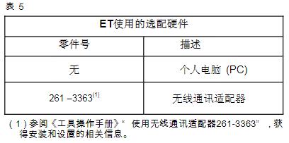 2.在通讯适配器(3)的计算机端和电脑RS232串口之间连接线缆(2)。注意:不配备RS232串口的计算机需要用237-7547适配器线连接USB口。3. 在通讯适配器“ 数据链路” 端和服务工具接头之间连接线缆(4)。4. 接上ECM的电源。如果ET和适配器不能与电子控制模块(ECM)通讯,参阅《故障排除》没有诊断代码时的故障排除“ 电子服务工具不能与ECM通讯” 。用无线通讯适配器通讯表5列出了用无线连接方式连接ET所需的选配硬件。