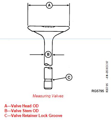 3.测量约翰迪尔强鹿柴油机阀头外径(A)。比较阀杆O、 D.(B)用导向器内径确定间隙,如本组下文所述。