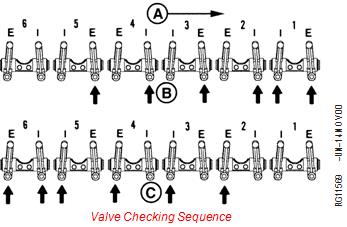 规格摇臂盖到托架盖螺钉扭矩……8牛•米(5.9磅-英尺)阀门检查顺序A-强鹿约翰迪尔柴油发动机前部B-编号。1缸“TDC”C-No。6缸“TDC”强鹿约翰迪尔柴油发动机D-前部