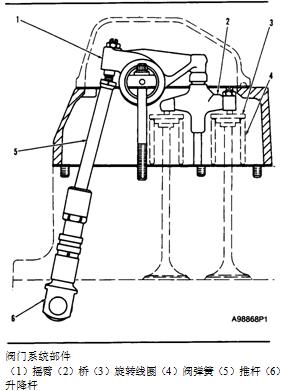(1)摇臂(2)桥(3)旋转线圈(4)阀弹簧(5)推杆(6)升降杆