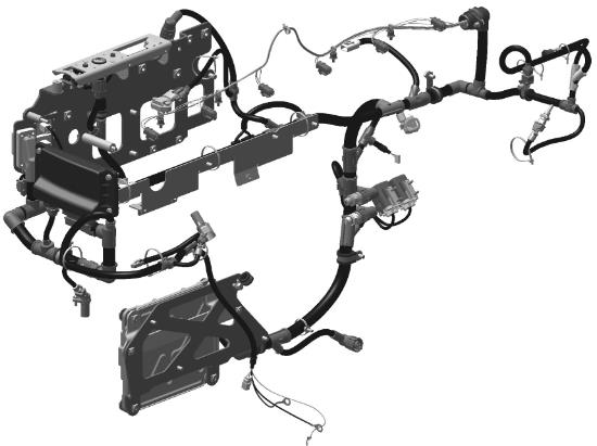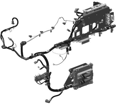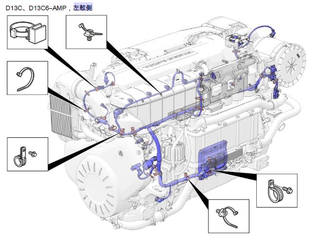以下两页显示如何将导线线束安装到发动机上。如需更换线束,参见电缆干线,更换 408 页。重要!对发动机进行作业结束时,必须按照图示重新准确安装已拆下的导线线束和软管。安装不正确会造成振动损坏。D13B-A/B/G/H/J/K、D13C1-A、D13C2-A(下一页)空气过滤器后面的 PCU(电源控制单元)与发动机控制单元进行通讯。有用于 11 个传感器的触点。停止按钮位于左舷侧上的油过滤器壳体上方。发动机控制单元(ECU)位于左舷侧上的热交换器后面。D13B-C/D/E/F/L/M/N、D13C3-A、D13C4-A(前两页)空气过滤器后面的电源模块与发动机控制单元进行通讯。有用于 12 个传感器的触点。停止按钮位于电源模块上方。发动机控制单元(ECU)位于左舷侧上的热交换器后面。