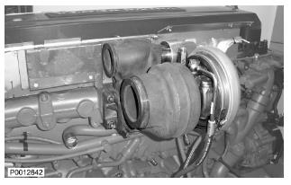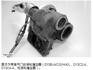 62 仅适用于 D13B-A/C/G/H/K/L,D13C2-A,D13C4-A(双涡轮增压器)检查废气门阀上的密封表面。检查将废气门壳体固定到涡轮增压器上的紧固件是否紧固。仅适用于 D13B-B/D/E/F/J/M/N,D13C1-A,D13C3-A(单涡轮增压器)检查涡轮增压器上的密封表面。