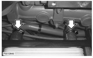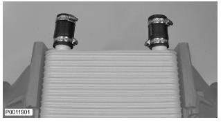 64 仅适用于 D13B-A/C/G/H/K/L,D13C2-A,D13C4-A(双涡轮增压器)清洁并检查后部增压空气冷却器软管接头和软管。检查软管连接处的管路。确保软管夹如图示固定在软管上。