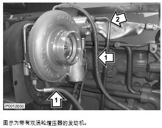 74 仅适用于 D13B-A/C/G/H/K/L,D13C2-A,D13C4-A(双涡轮增压器)安装涡轮增压器和废气门阀输油软管。用一个电缆结将废气门阀输油软管固定到涡轮增压器回油管上。