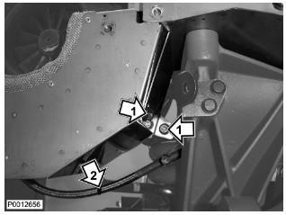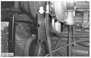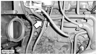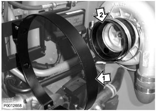 72 仅适用于 D13B-A/C/G/H/K/L,D13C2-A,D13C4-A(双涡轮增压器)安装将隔热罩固定到歧管上的两个螺栓和垫片(1)。不要完全紧固螺栓。安装将隔热罩侧面固定到其下部的螺栓。用中心螺栓夹紧输油软管(2)。不要完全紧固螺栓。