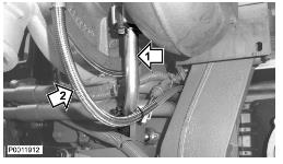 7 拆下供油管(1)和夹子。拆下用于冷却水的冷却剂软管(2)。
