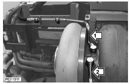 15 在沃尔沃涡轮增压器中加注新的、干净的发动机机油并用新密封件安装供油管(1)。用夹子将管线固定到发动机吊眼上。用新密封件安装新冷却剂连接(2)。