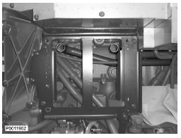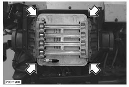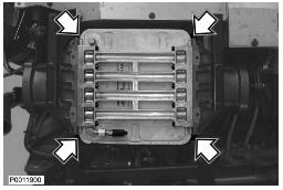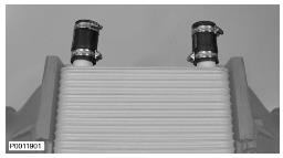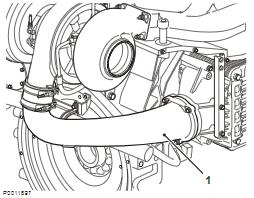 6 拆下增压空气冷却器的上部螺栓。拆下增压空气冷却器固定螺母。沿直线拉出增压空气冷却器。确保软管从增压空气冷却器上脱离。