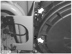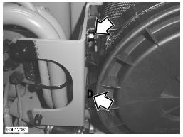 2 松开两个过滤器壳体螺母并拆下过滤器。注意 交替松开将夹子紧固到过滤器下面的螺栓。图示为 D13B-A/G/H/K 发动机(双涡轮增压器)。
